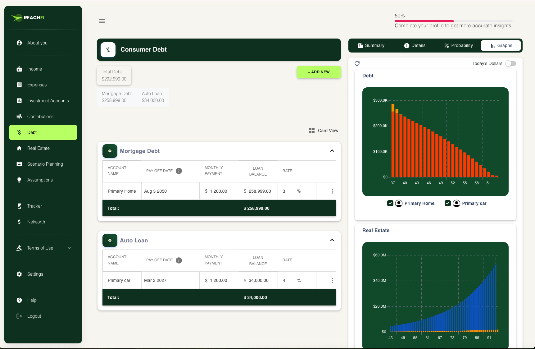 ReachFI lets you project your net worth and liquid net worth 5, 10, or even 20 years from now. Visualize how your assets will grow, plan for big purchases, and ensure your financial goals stay on track.