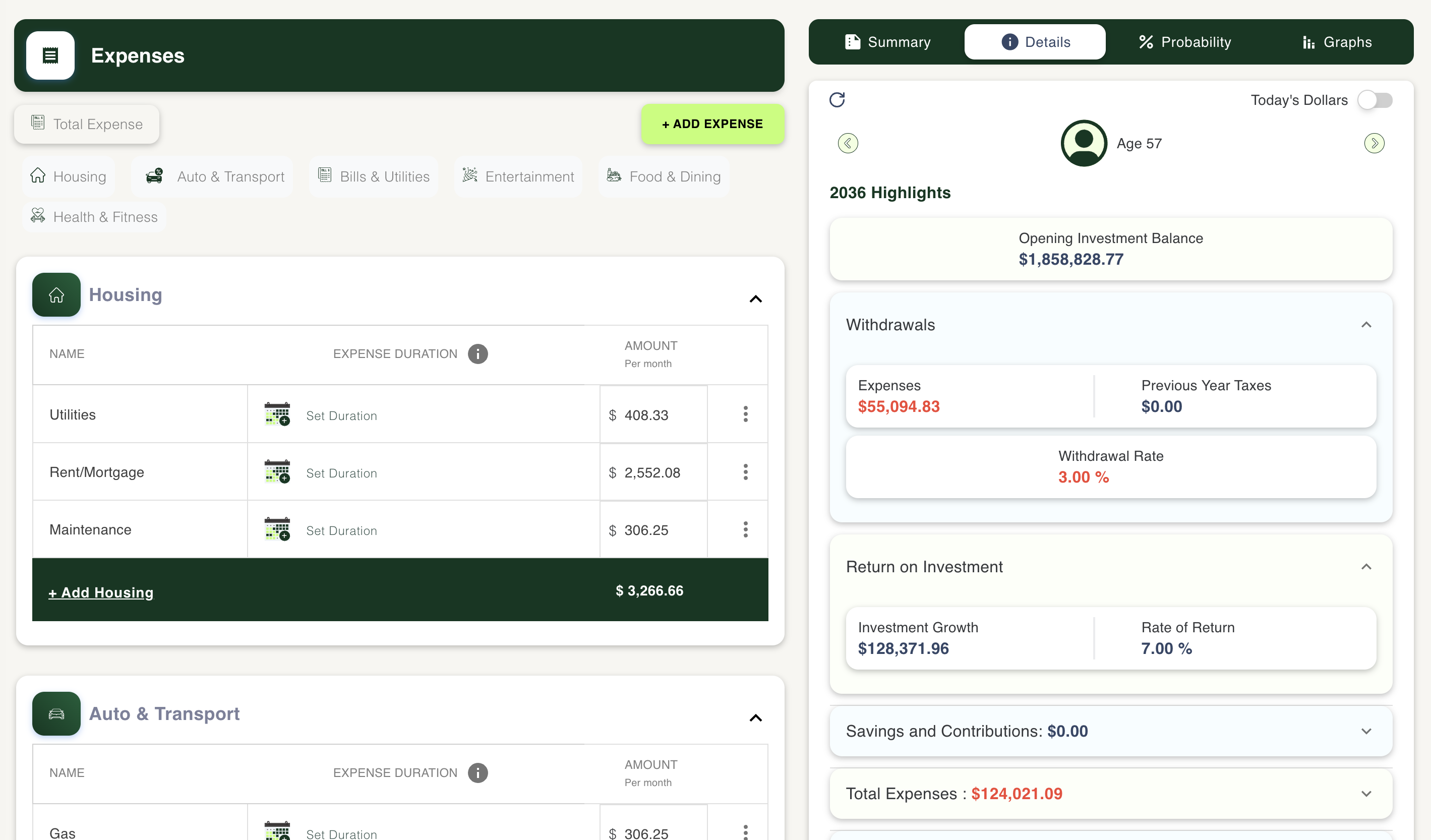 Expenses can be modified to suit every stage of life. From adjusting for early career budgets to expanding for family growth, or scaling back for retirement, users can adapt their expenses dynamically.