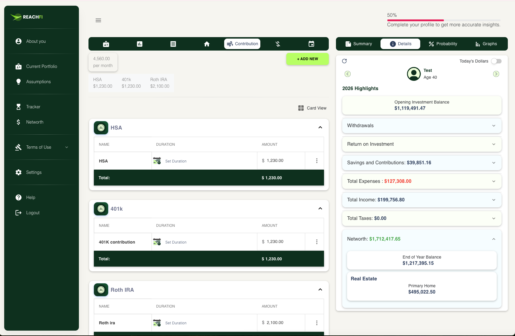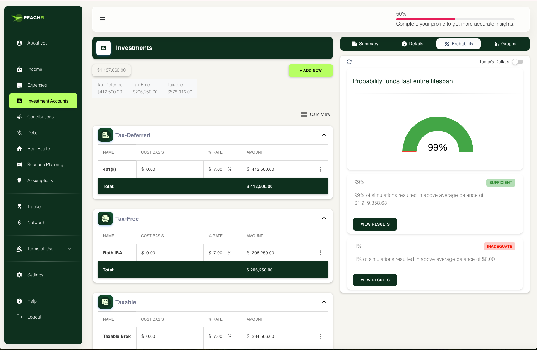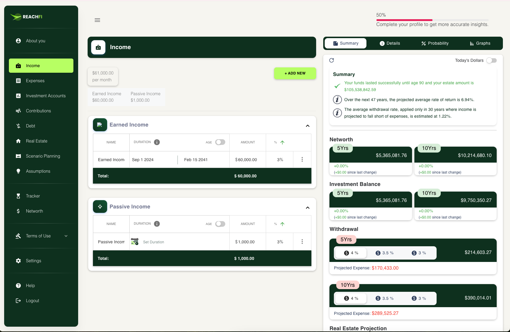 - Wondering where you will stand in 5 or 10 years? ReachFI provides detailed projections for your net worth and investment growth over time. Understand the impact of different rates of return and plan accordingly.