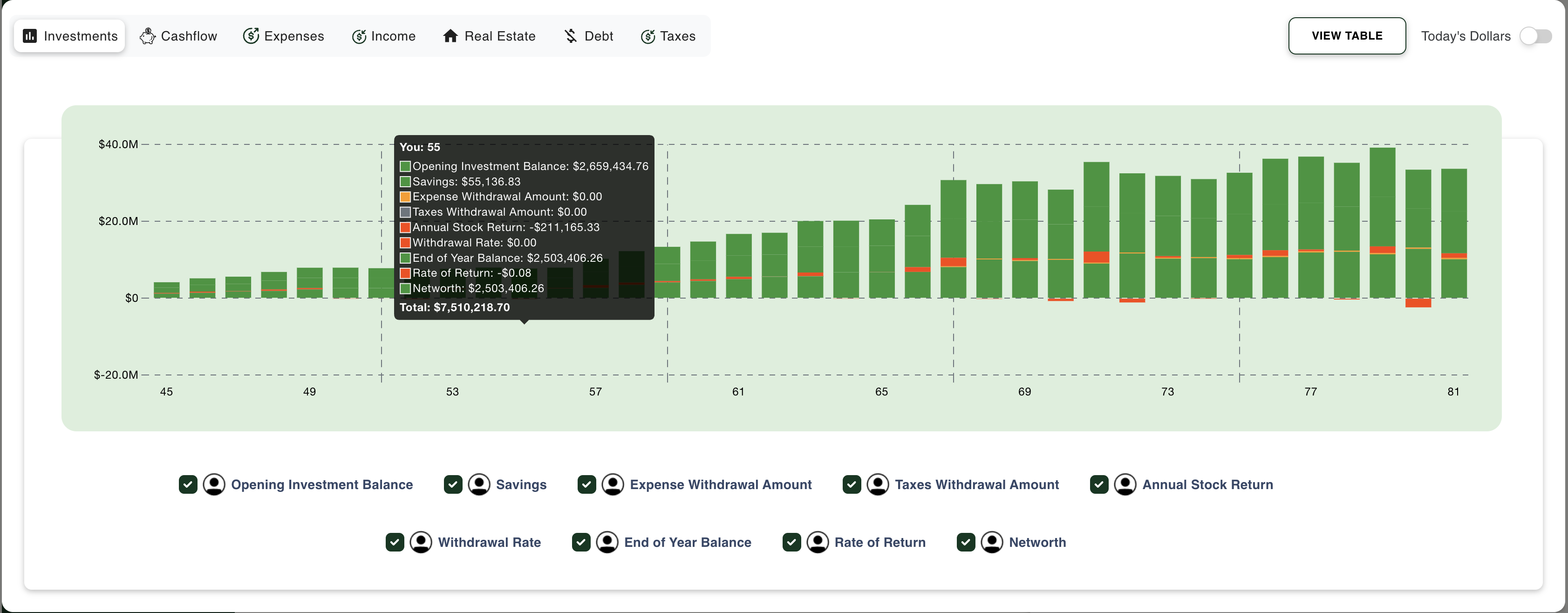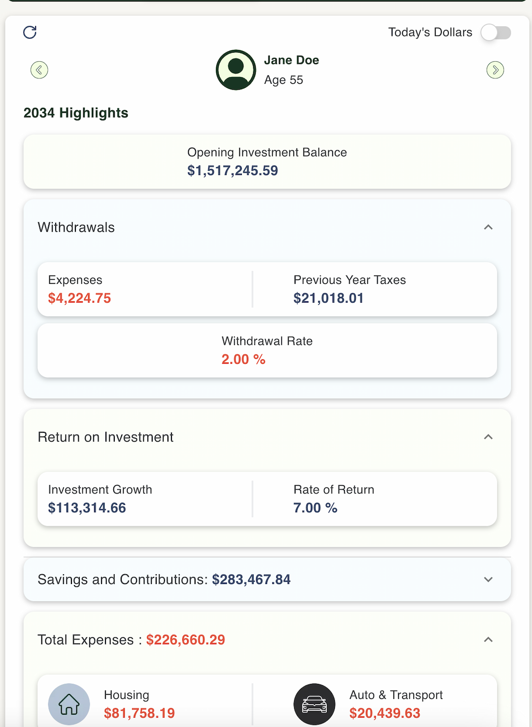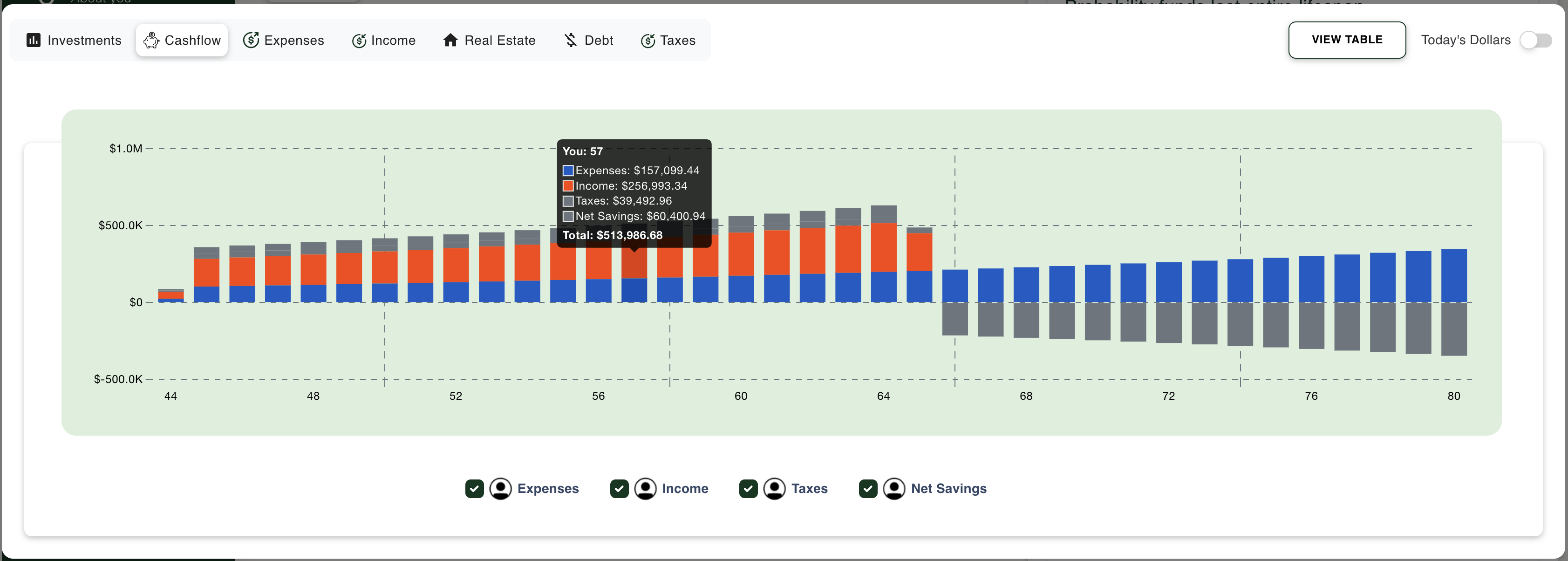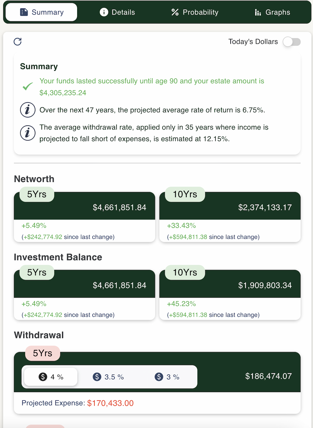 - Not sure how much you can spend without compromising your future? Experiment with different expense scenarios to see how they affect your retirement funds. Find the perfect balance to sustain your lifestyle while ensuring your assets last.