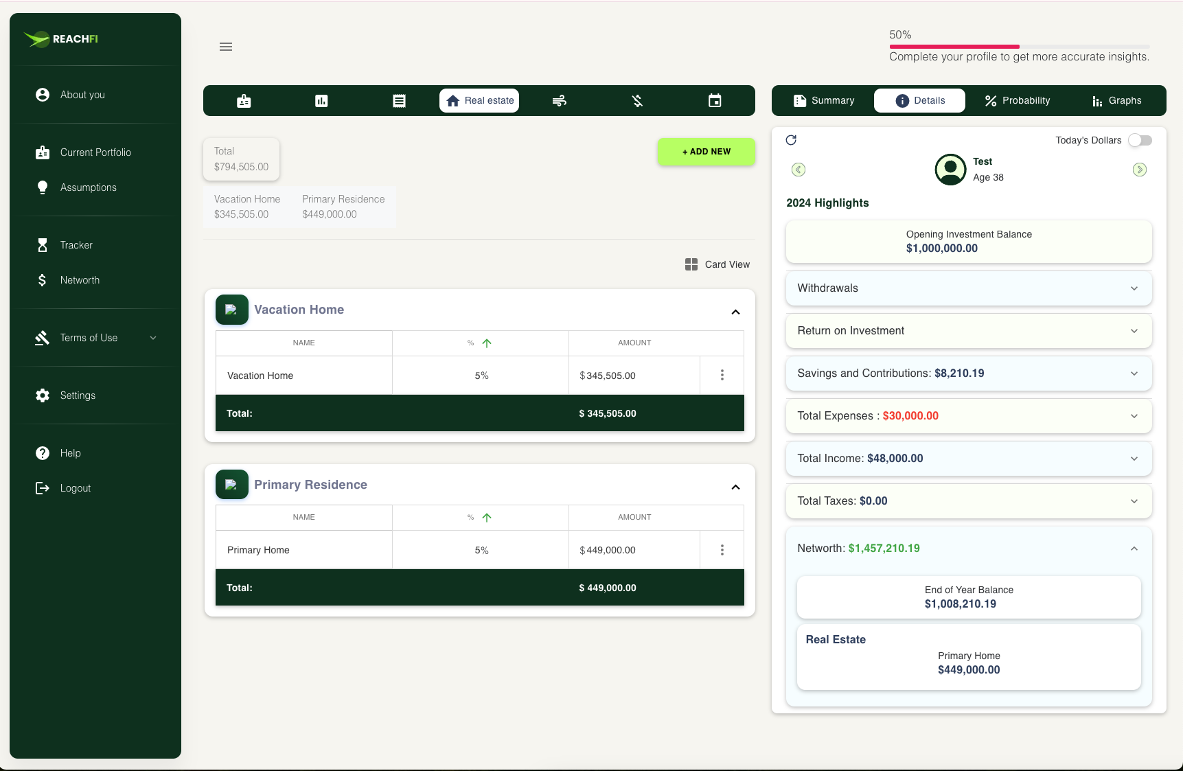 ReachFI provides year-by-year projections across all key financial metrics, including income, expenses, net worth, and cash flow. Easily visualize your financial future with detailed forecasts, allowing you to adjust your strategy as needed to stay on track towards your financial goals. Whether planning for retirement, managing your investments, or budgeting for life changes, ReachFI gives you a clear, comprehensive view of your financial journey.