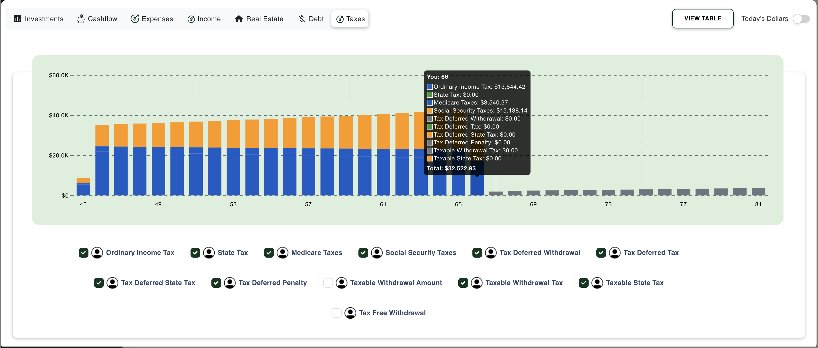 - Explore detailed tax projections with ReachFI, including federal, state, and capital gains taxes. Understand the impact of different income levels, withdrawals, and investment strategies on your tax liabilities, helping you make informed decisions to optimize your financial future.